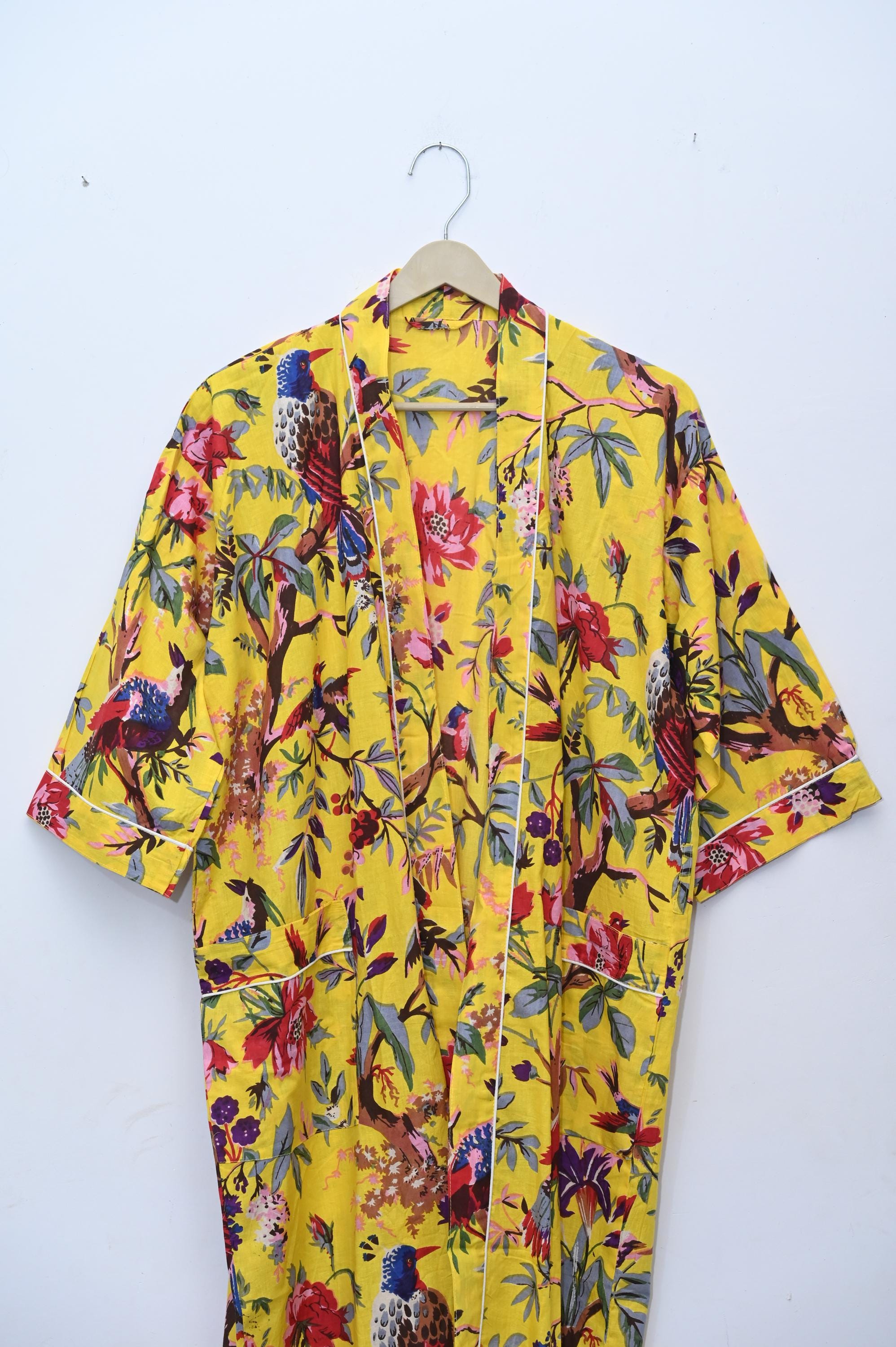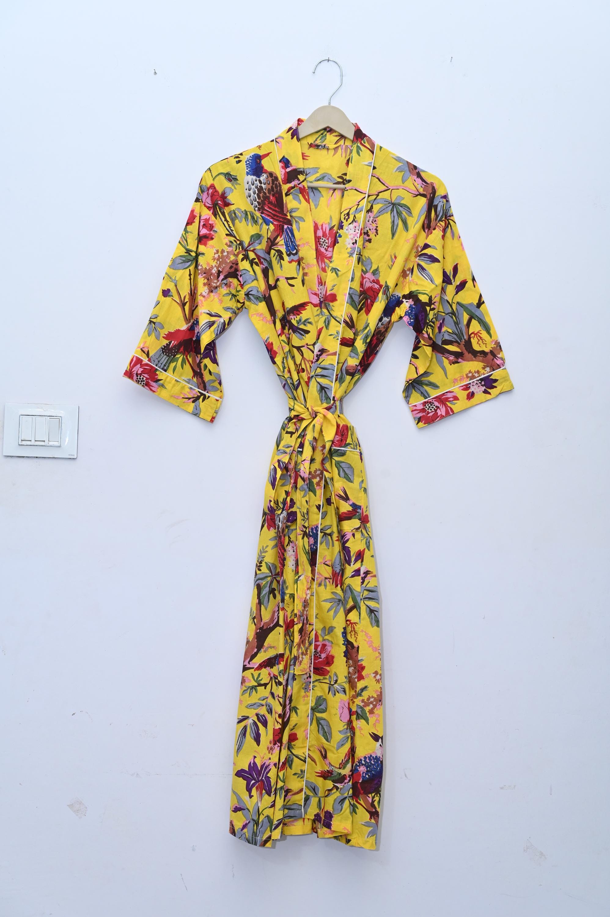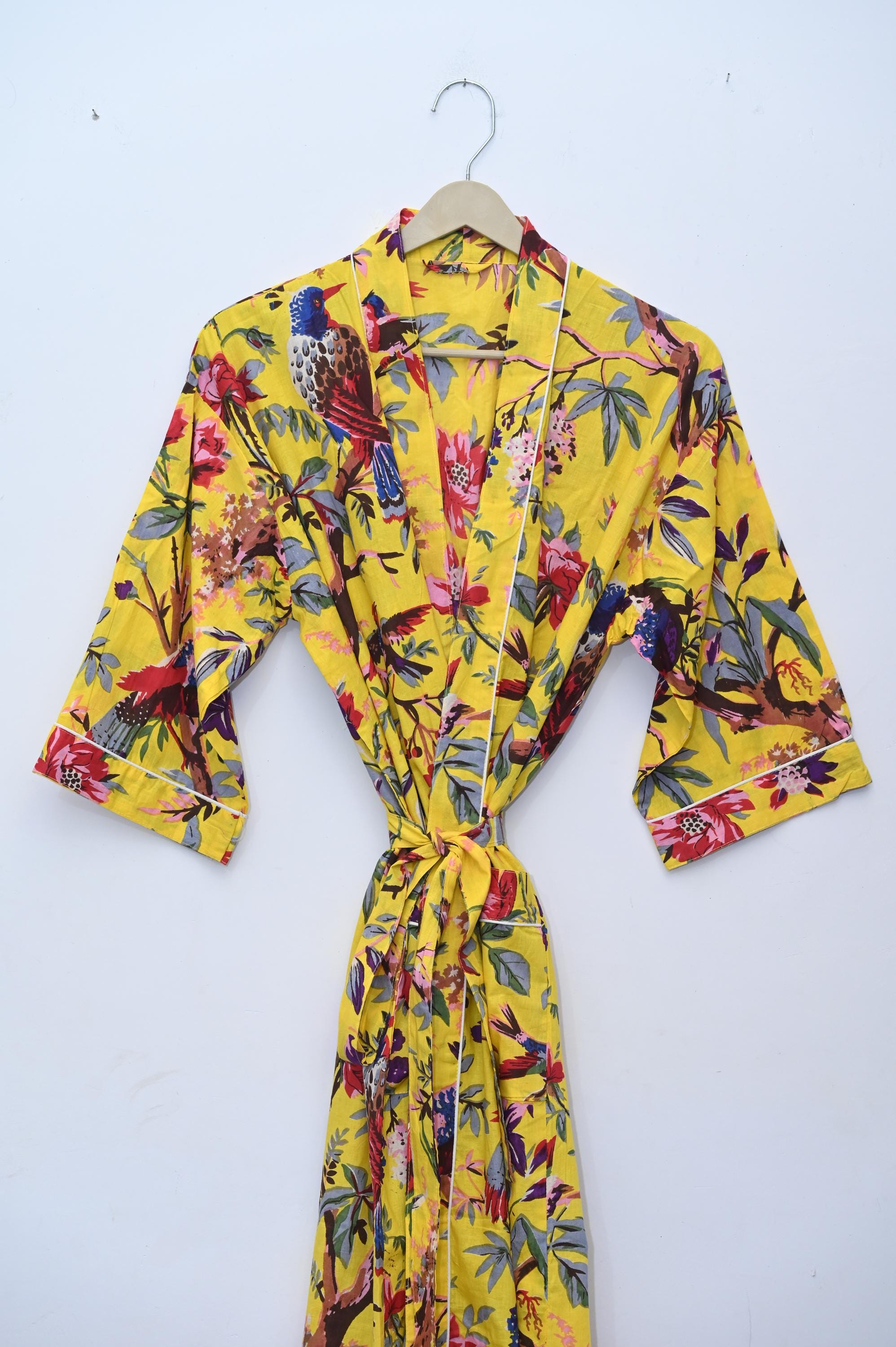 The block print floral robe features 3/4th sleeves, a waist tie and two front pocket. Cotton kimono robes are perfect for lounging around the home or spa. Use our block print robe as a cover up on the beach or after a dip in the pool. Add a luxe, boho feel to your bridal shower. Versatile, soft and luxurious, our 100% cotton kimono robes are printed with azo-free dyes.