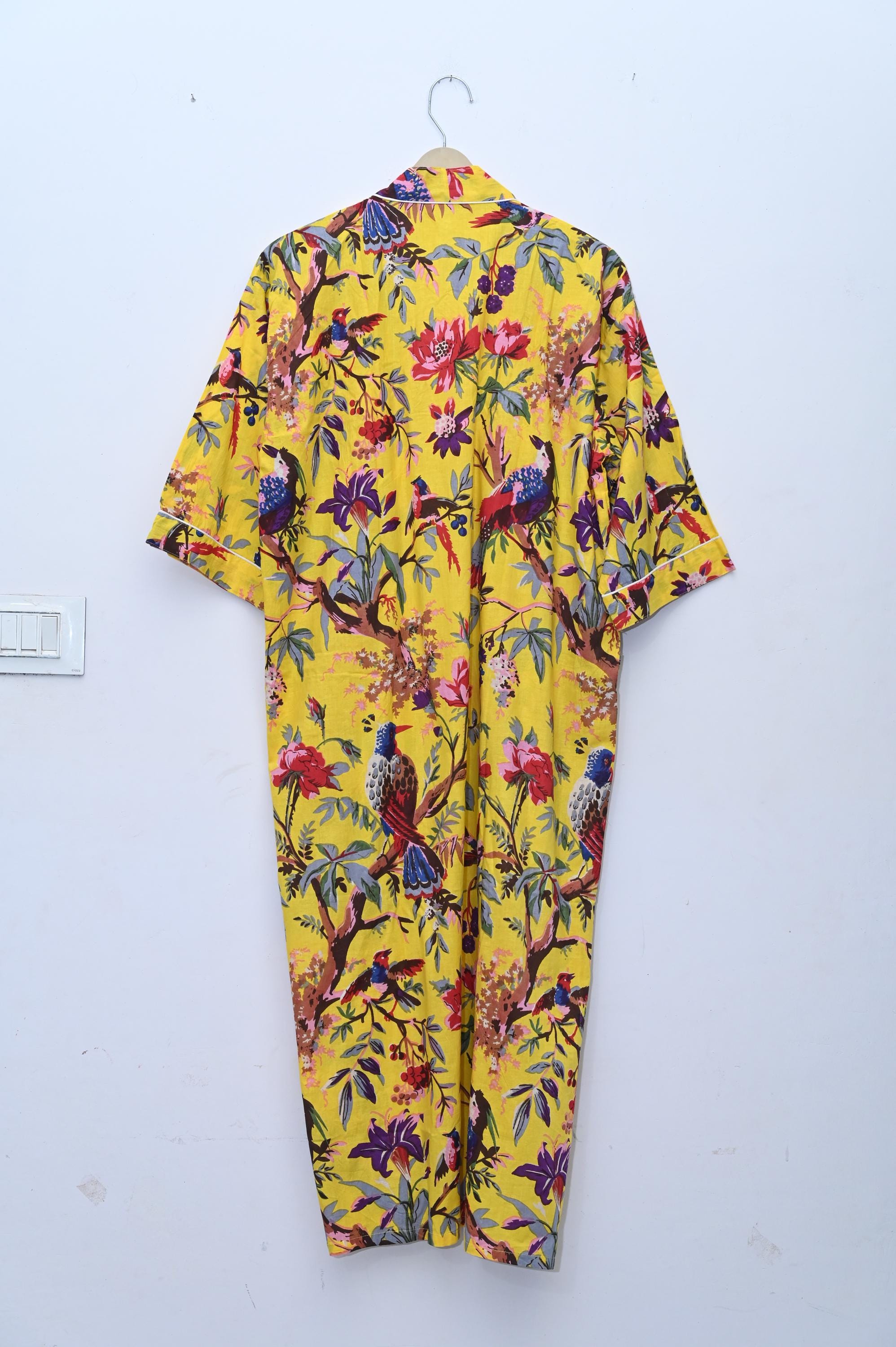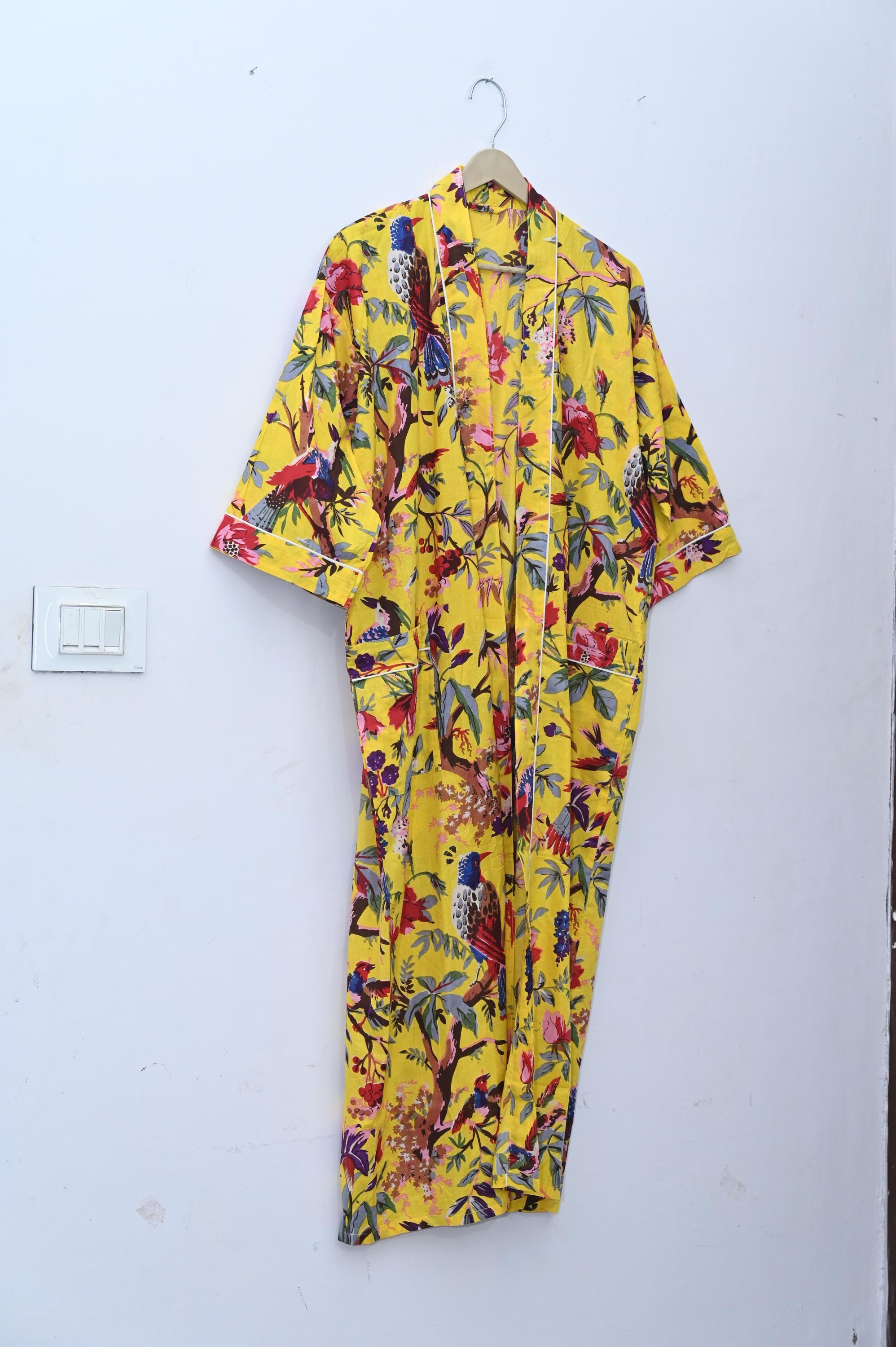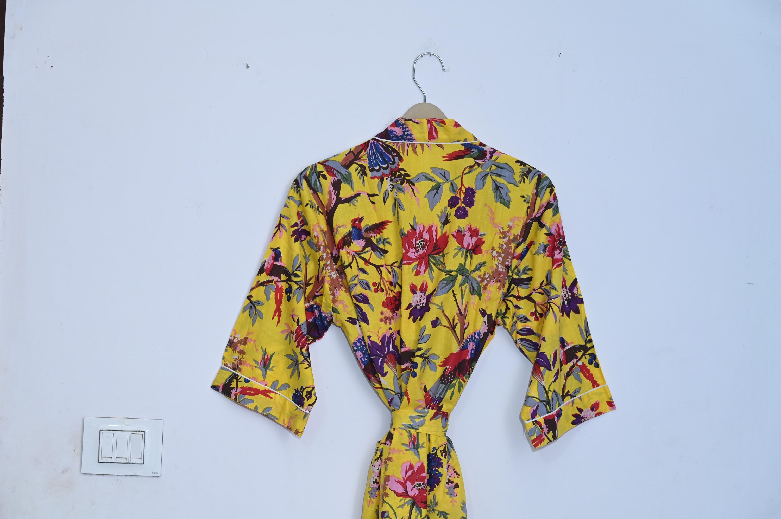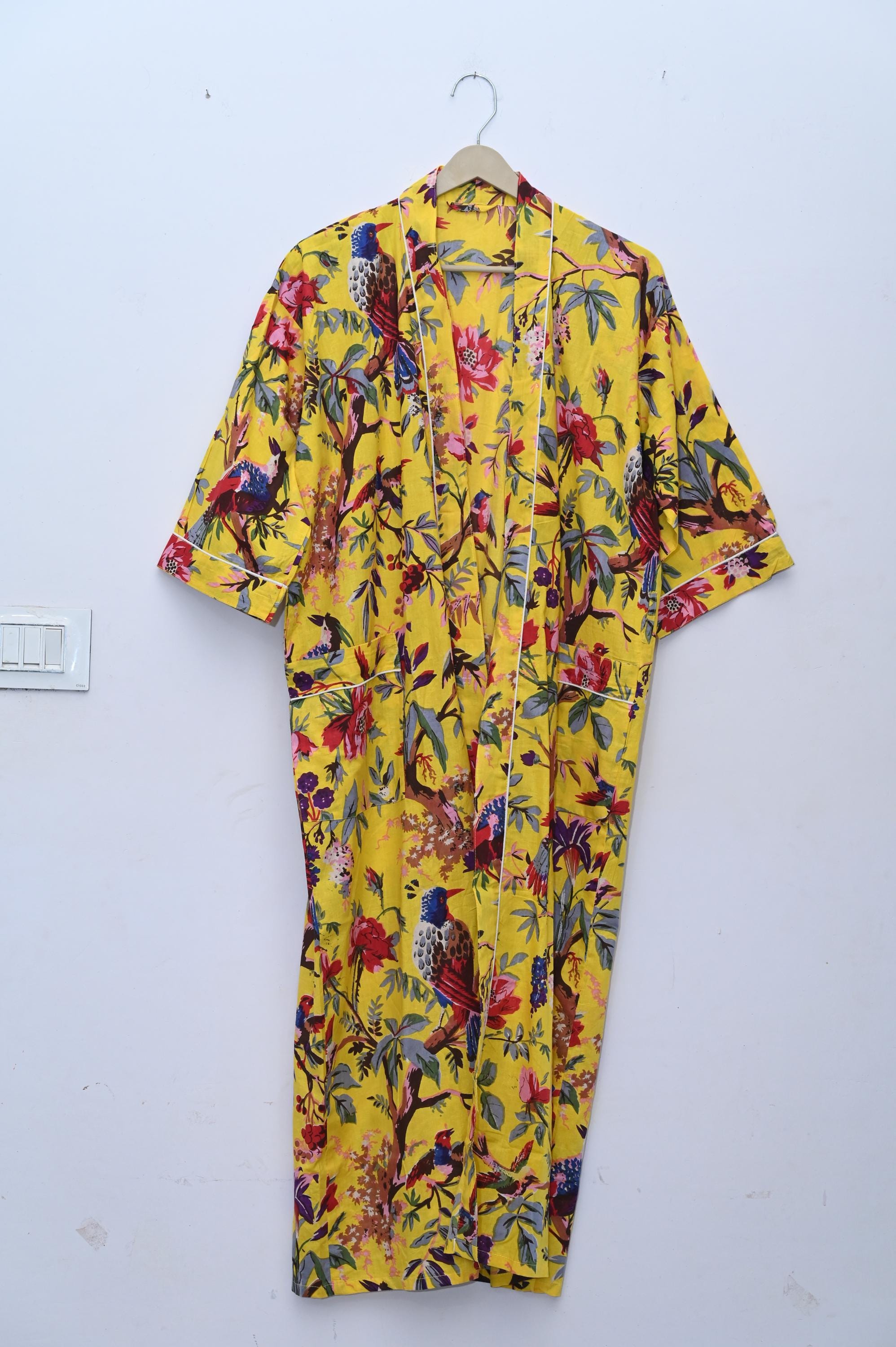 The block print floral robe features 3/4th sleeves, a waist tie and two front pocket. Cotton kimono robes are perfect for lounging around the home or spa. Use our block print robe as a cover up on the beach or after a dip in the pool. Add a luxe, boho feel to your bridal shower. Versatile, soft and luxurious, our 100% cotton kimono robes are printed with azo-free dyes.
