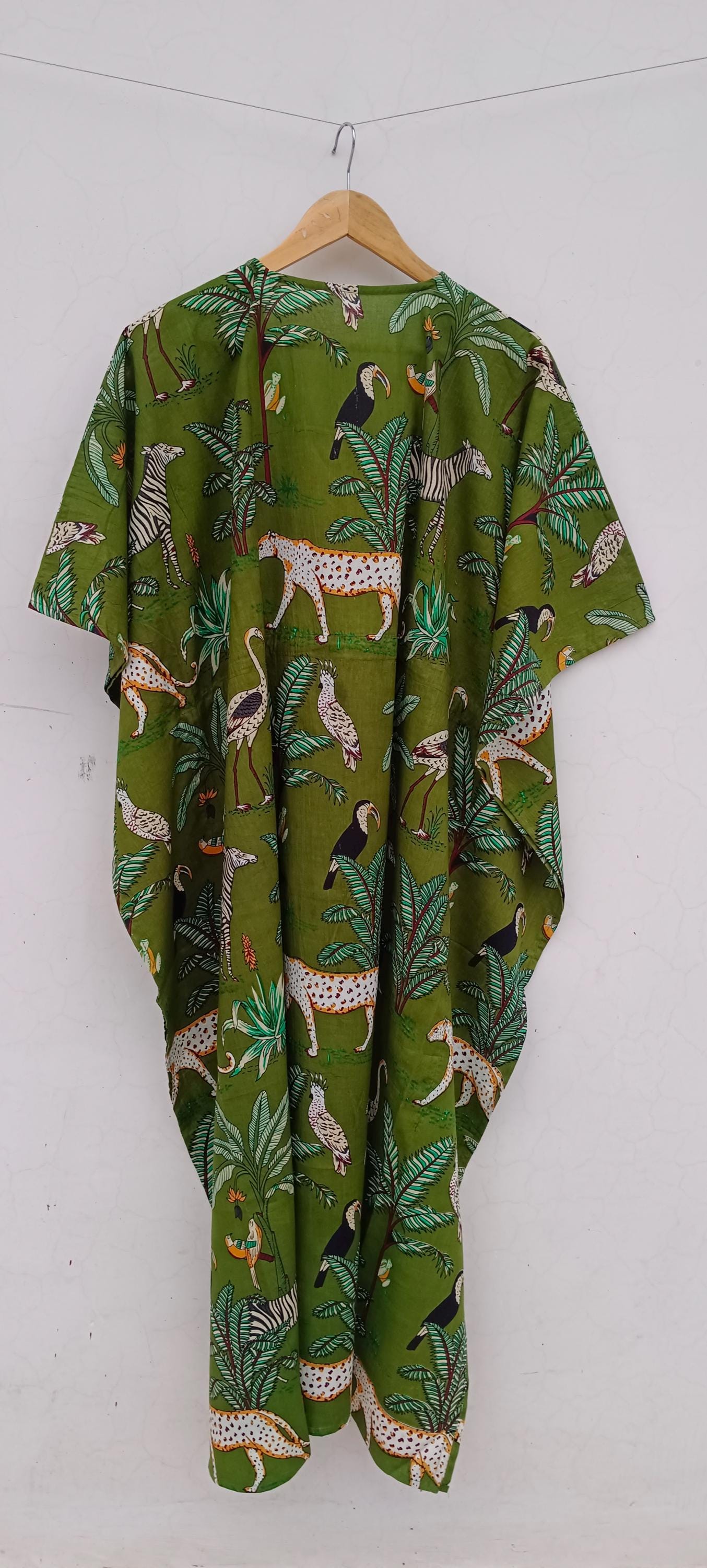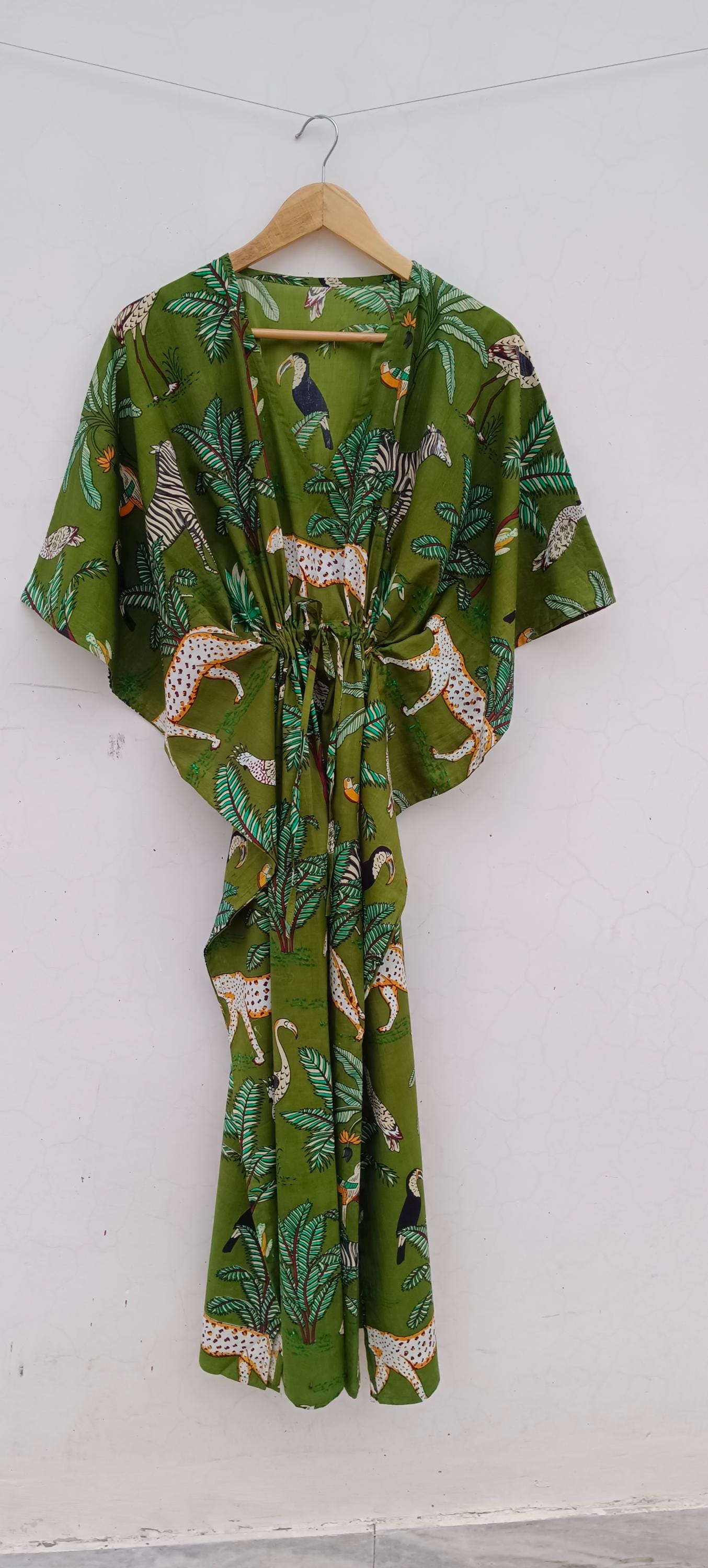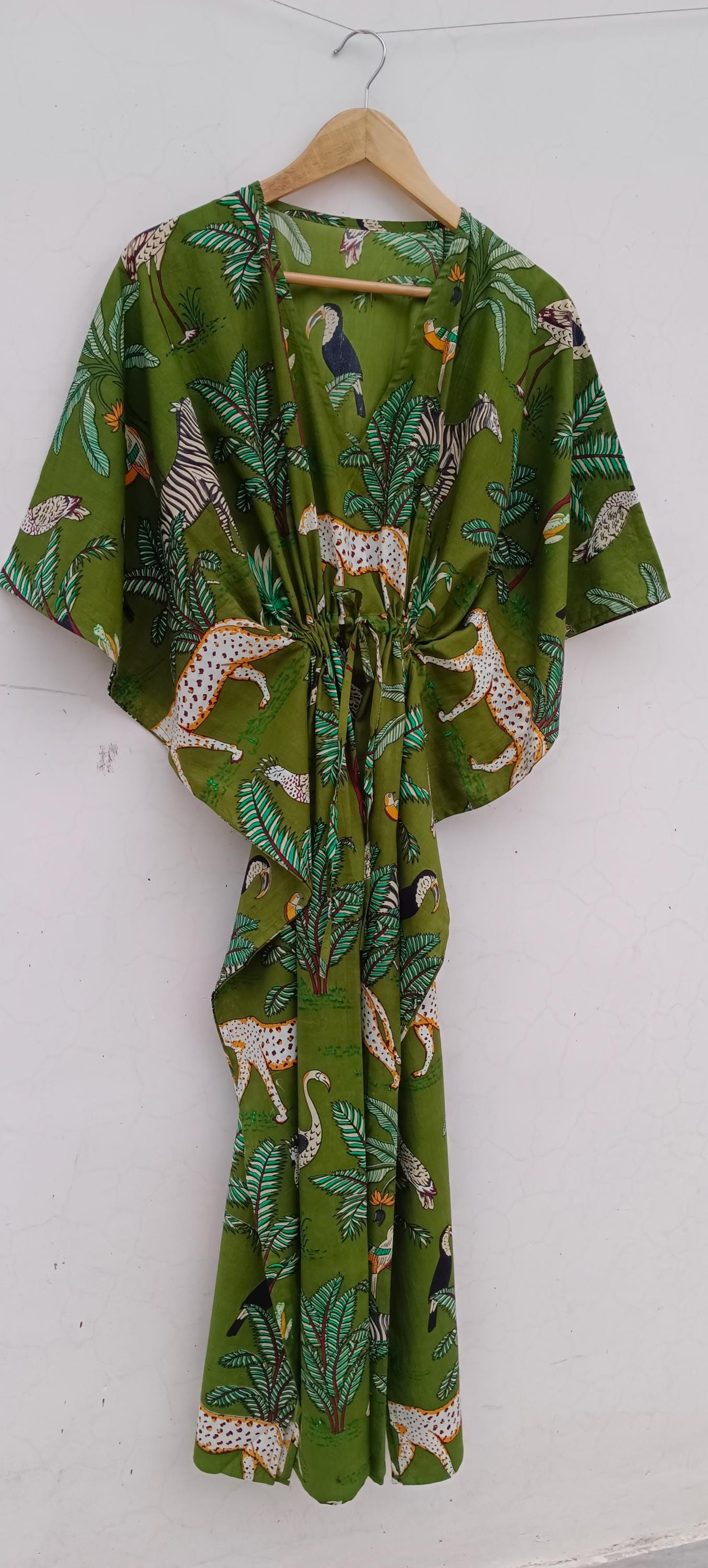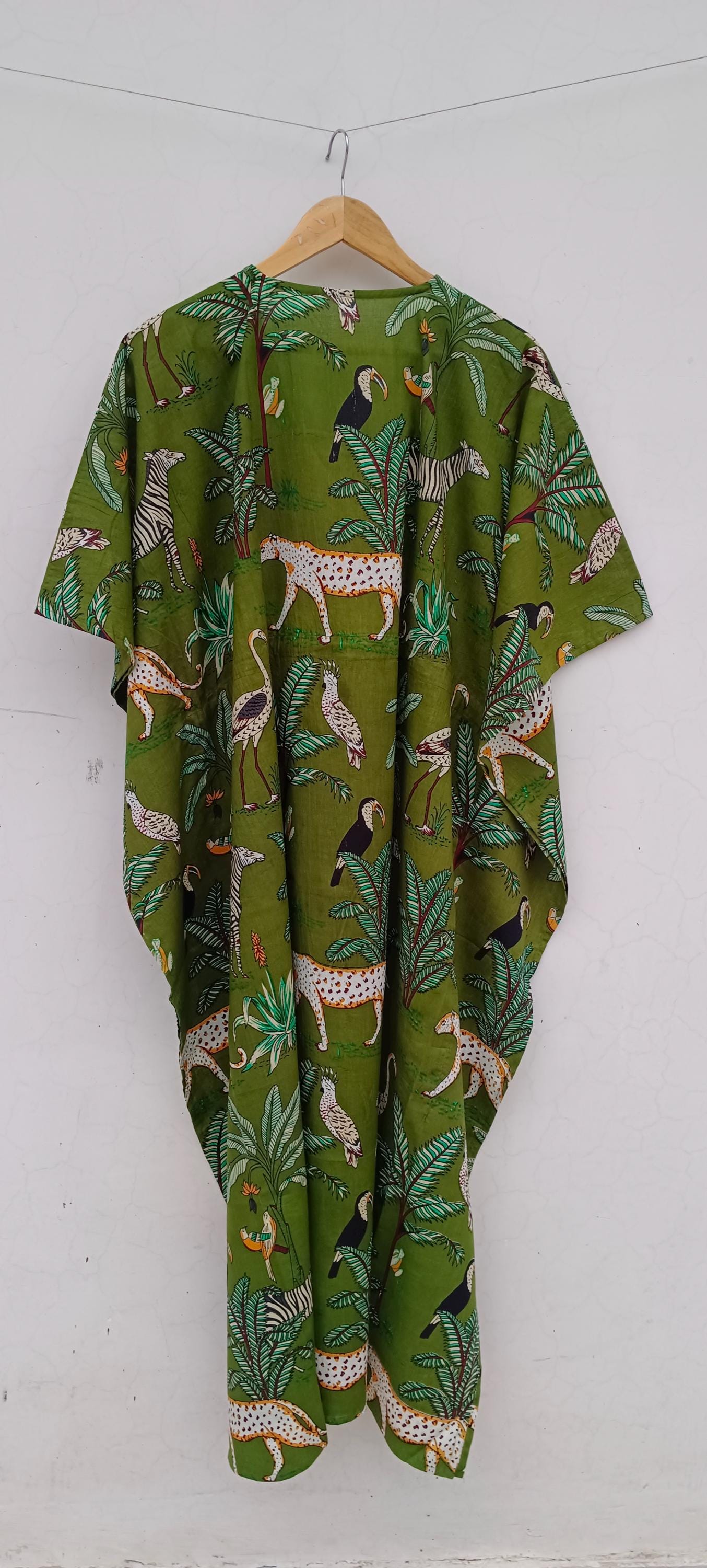 Floral Cotton Kaftan Dress: Bohemian Green Maxi Cover-Up