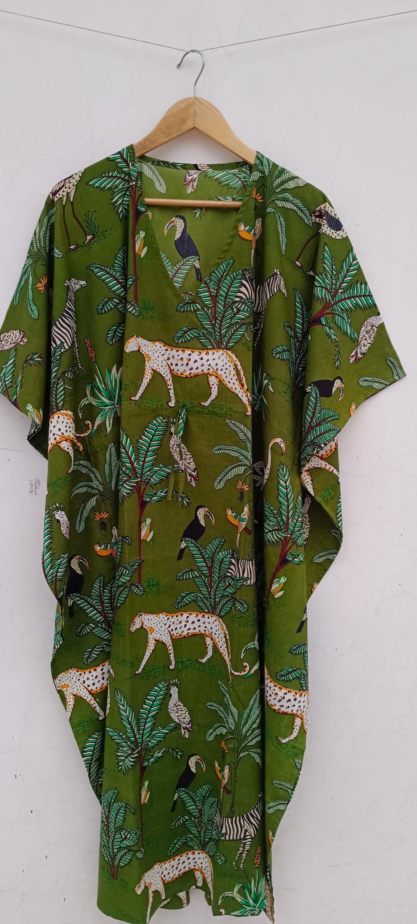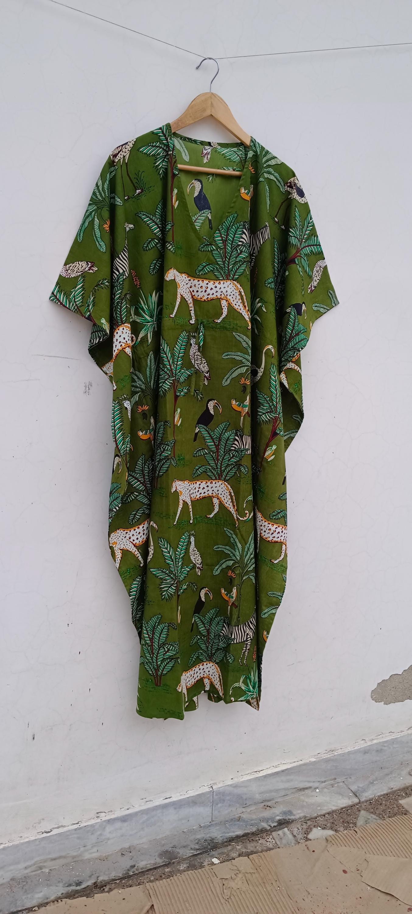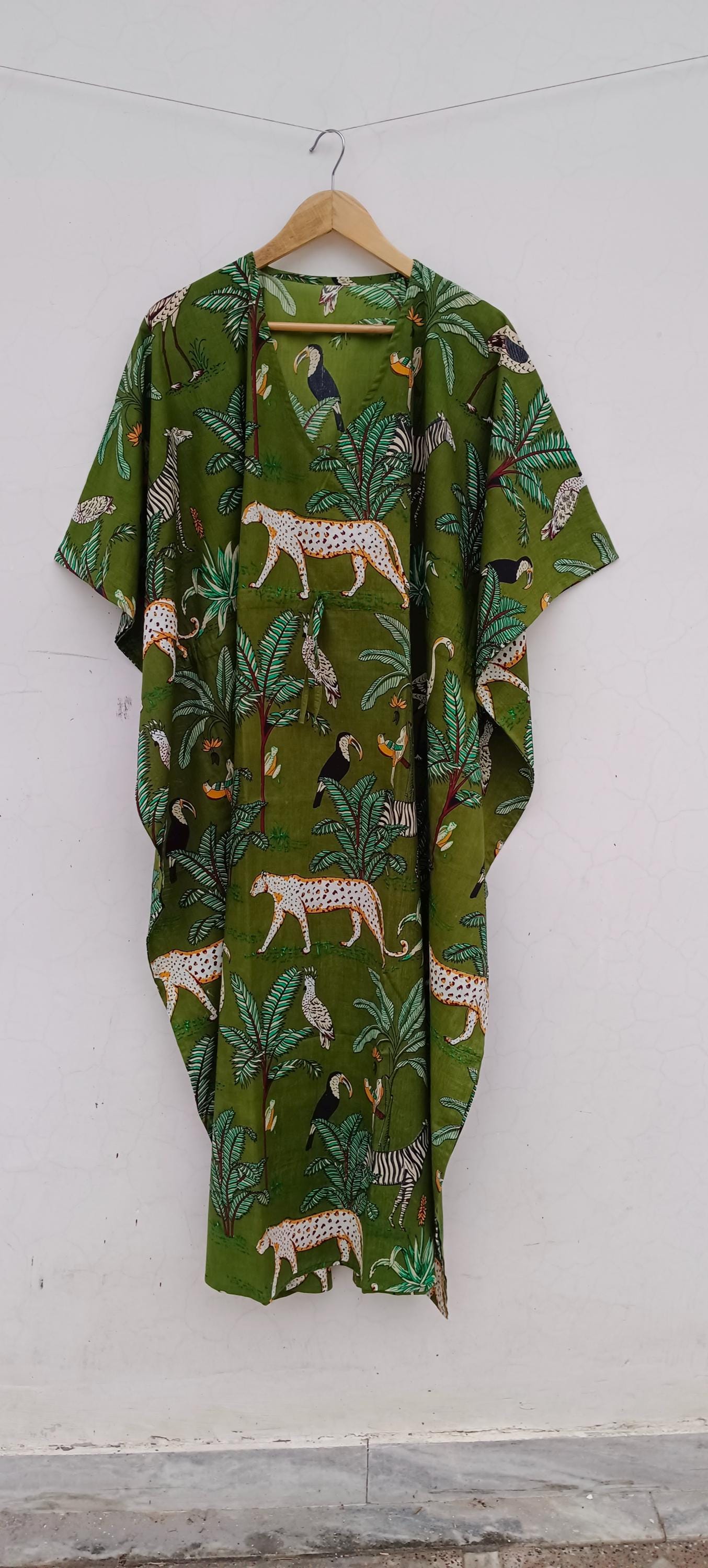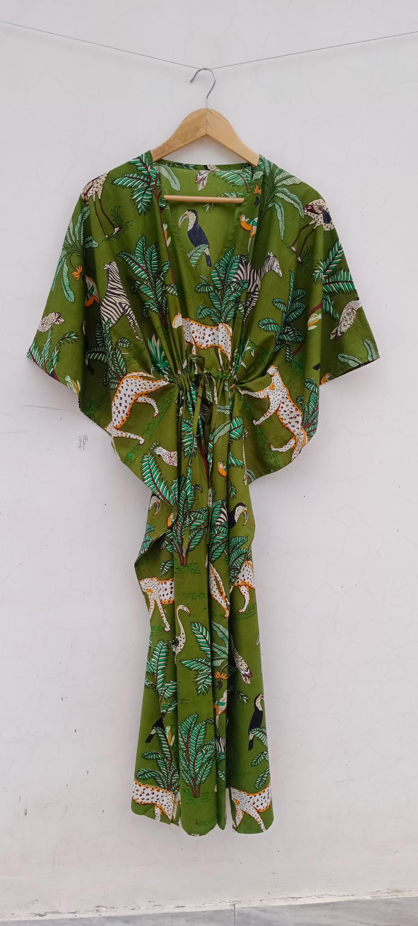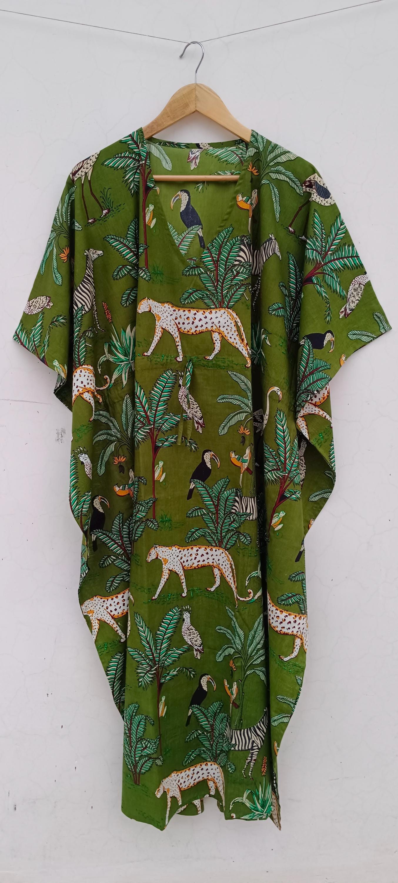 Floral Cotton Kaftan Dress: Bohemian Green Maxi Cover-Up