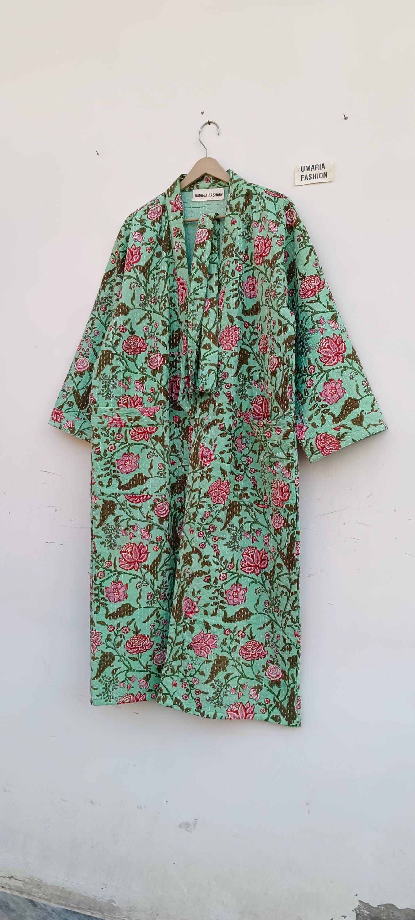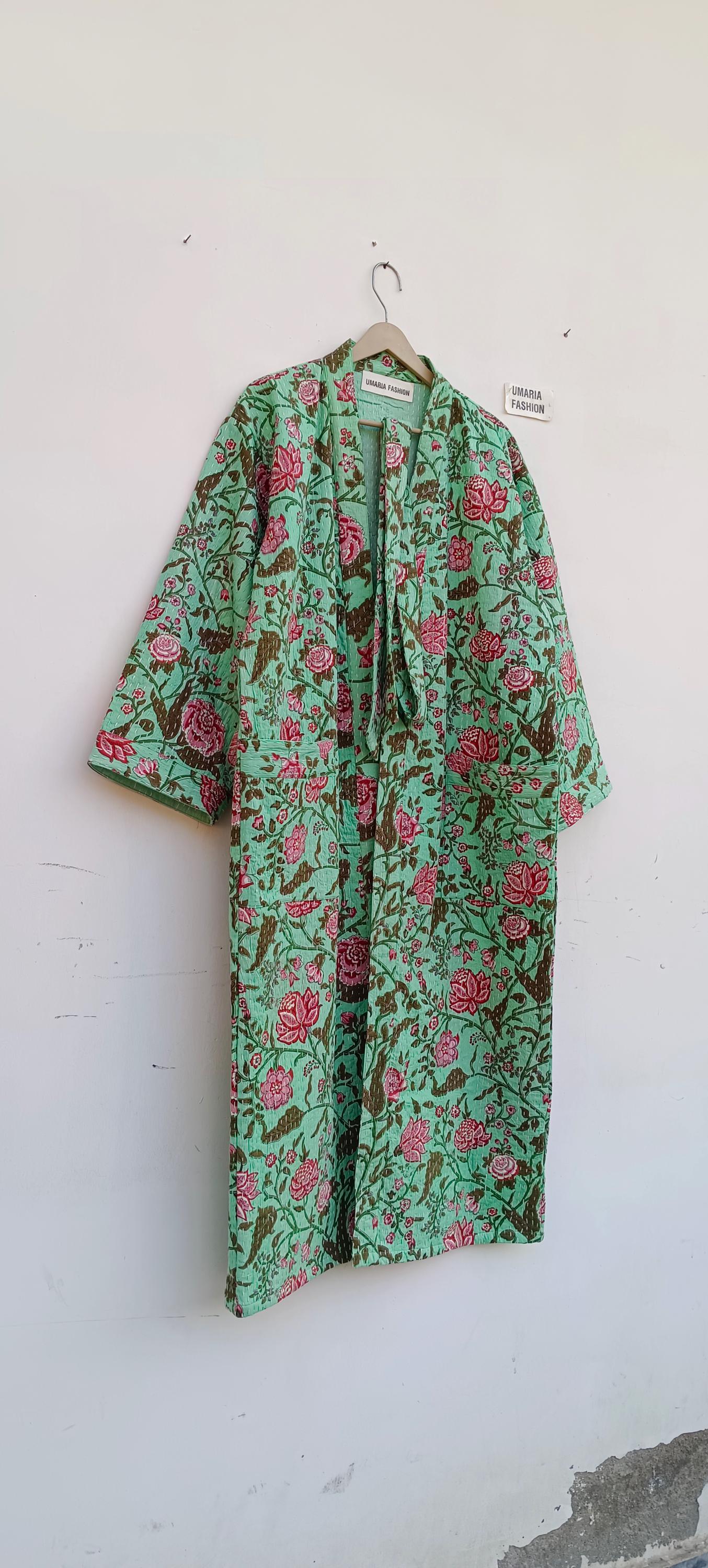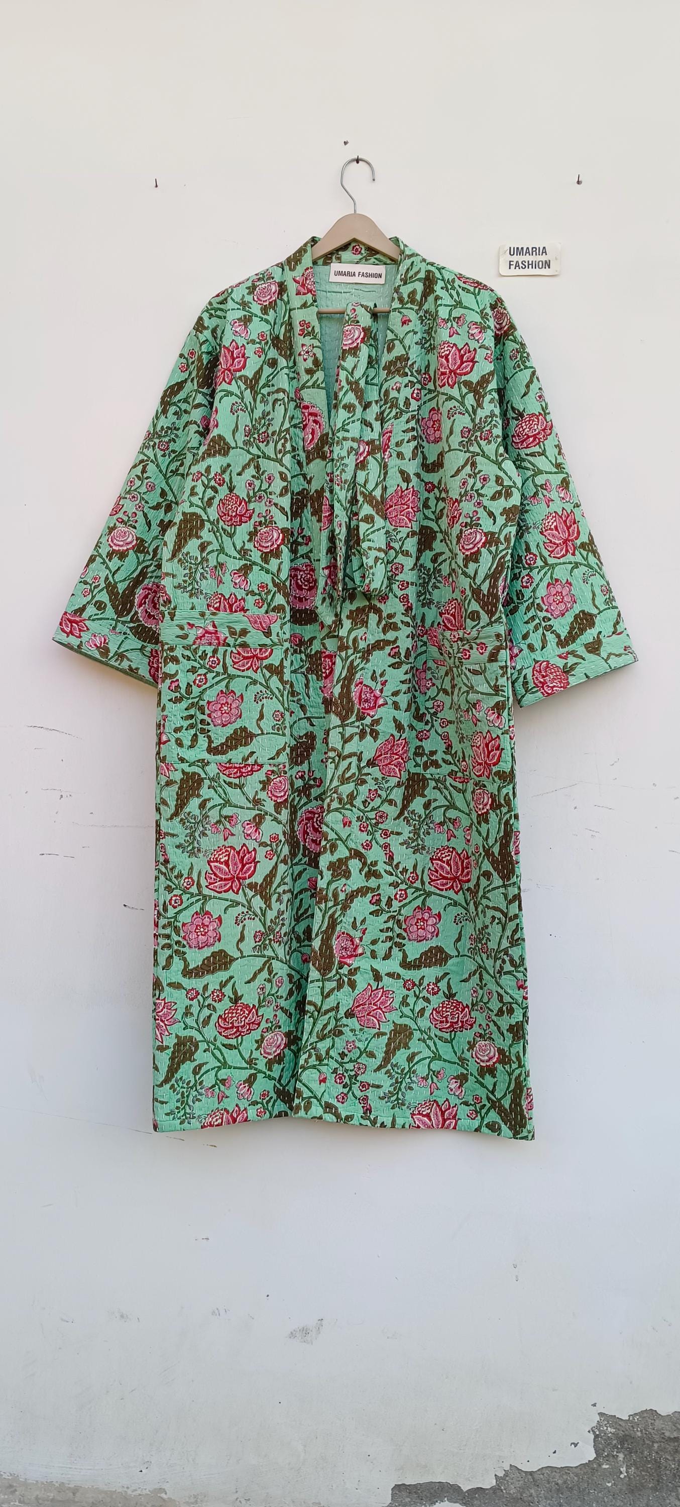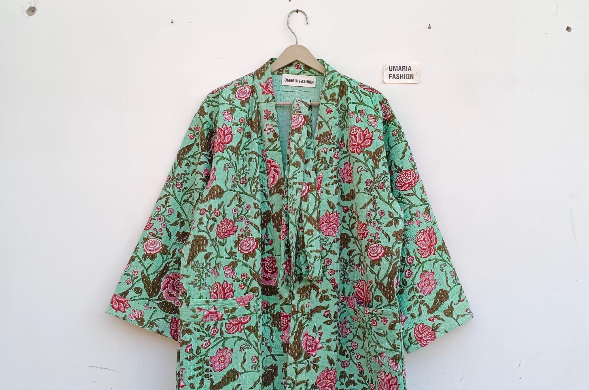 See details This Kimono is made of hand Kantha stitch fabric in patchwork . The fabric is a handmade printed fabric. Kantha stitch over the fabric gives it a unique look. It is two Layer of Cotton Kantha Stitch (Hand Quilted) Fabric Robe