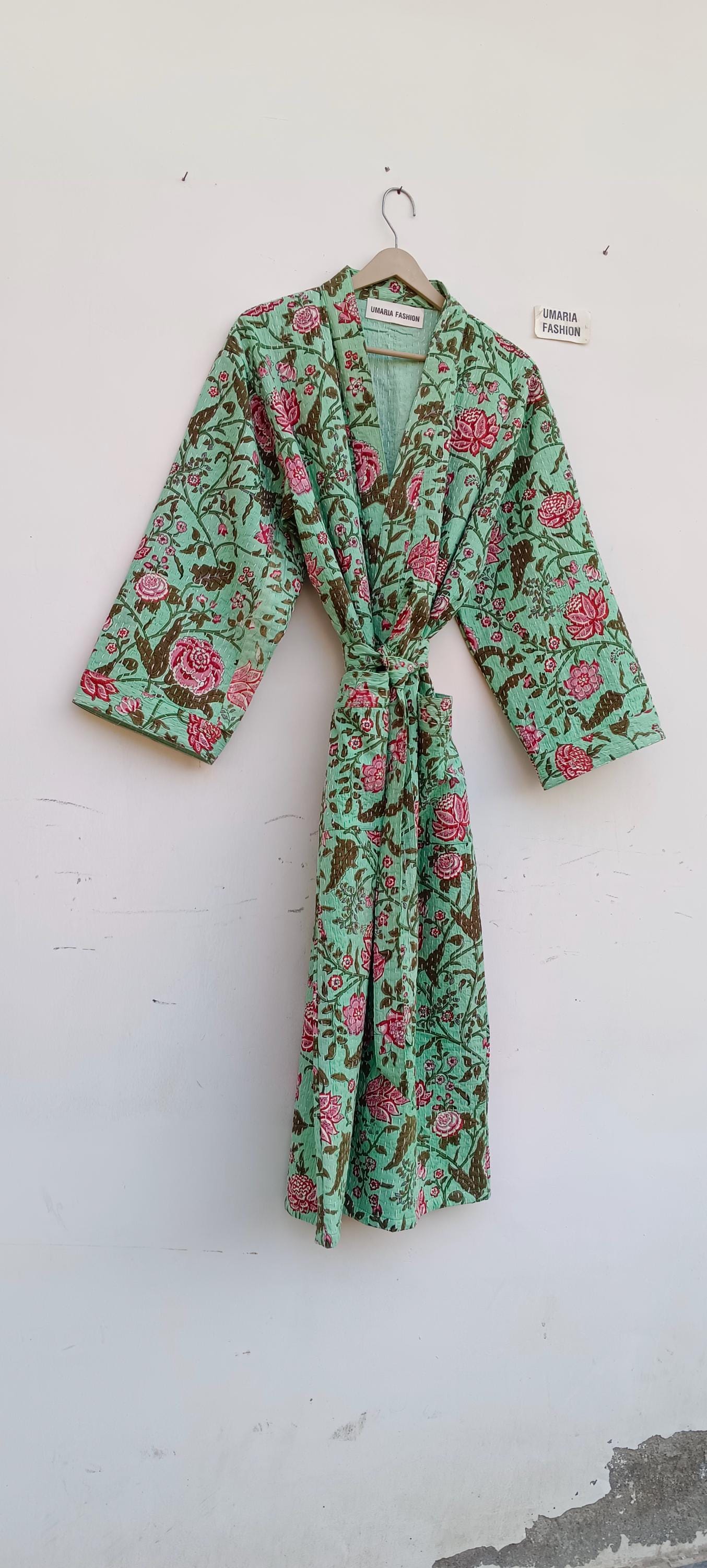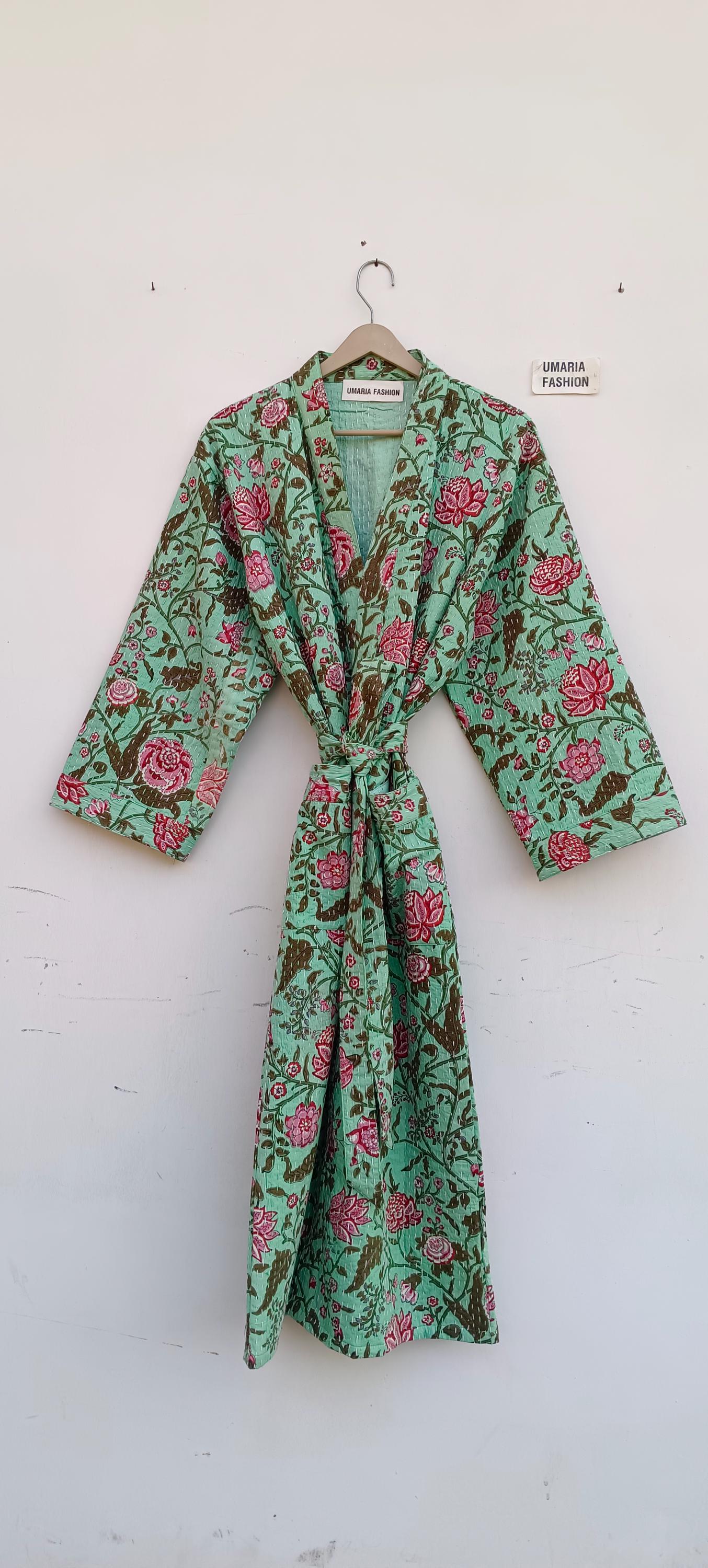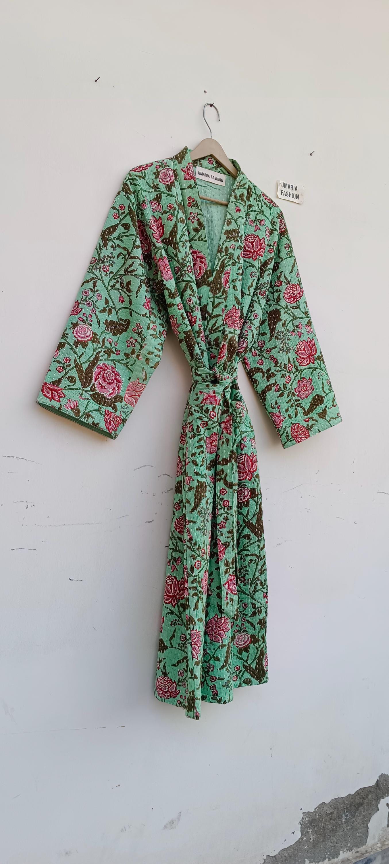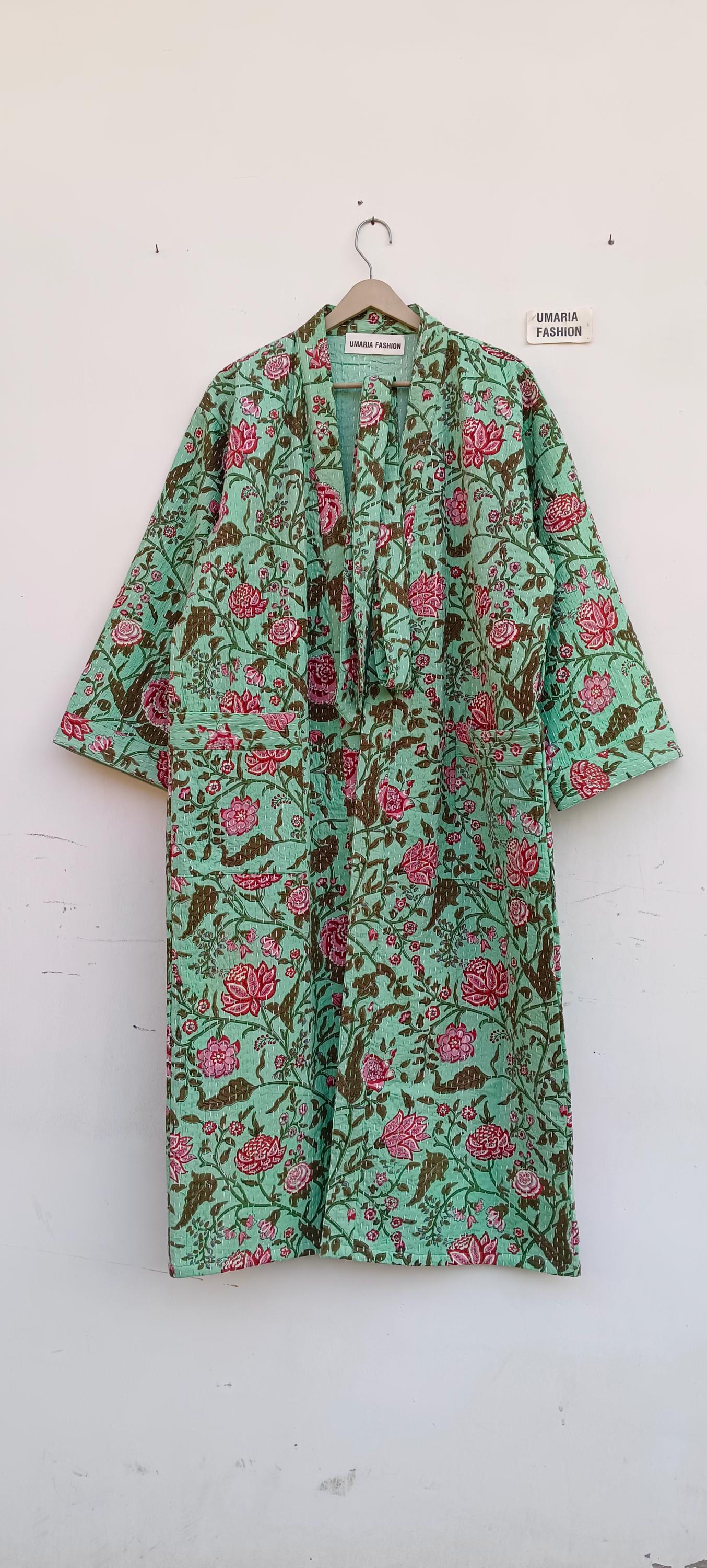 See details This Kimono is made of hand Kantha stitch fabric in patchwork . The fabric is a handmade printed fabric. Kantha stitch over the fabric gives it a unique look. It is two Layer of Cotton Kantha Stitch (Hand Quilted) Fabric Robe
