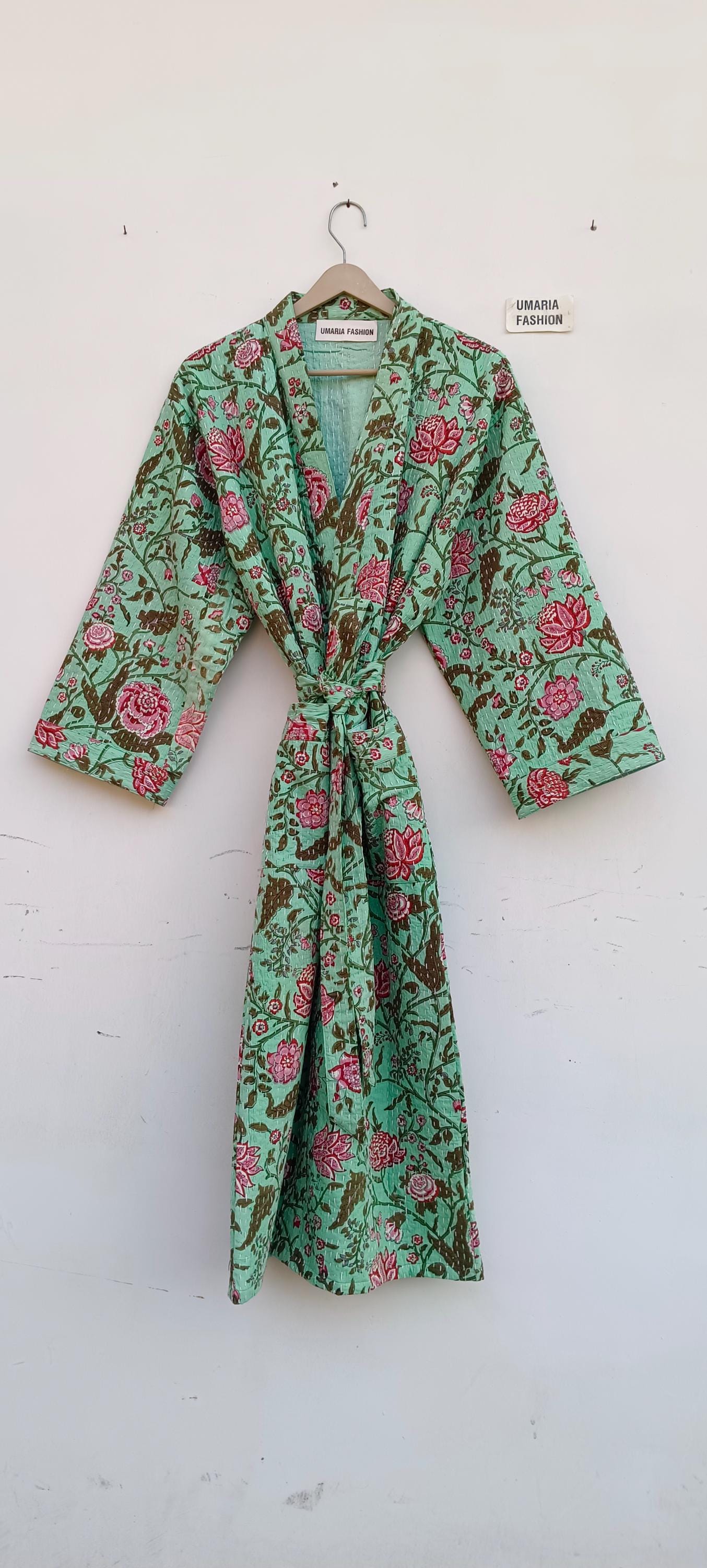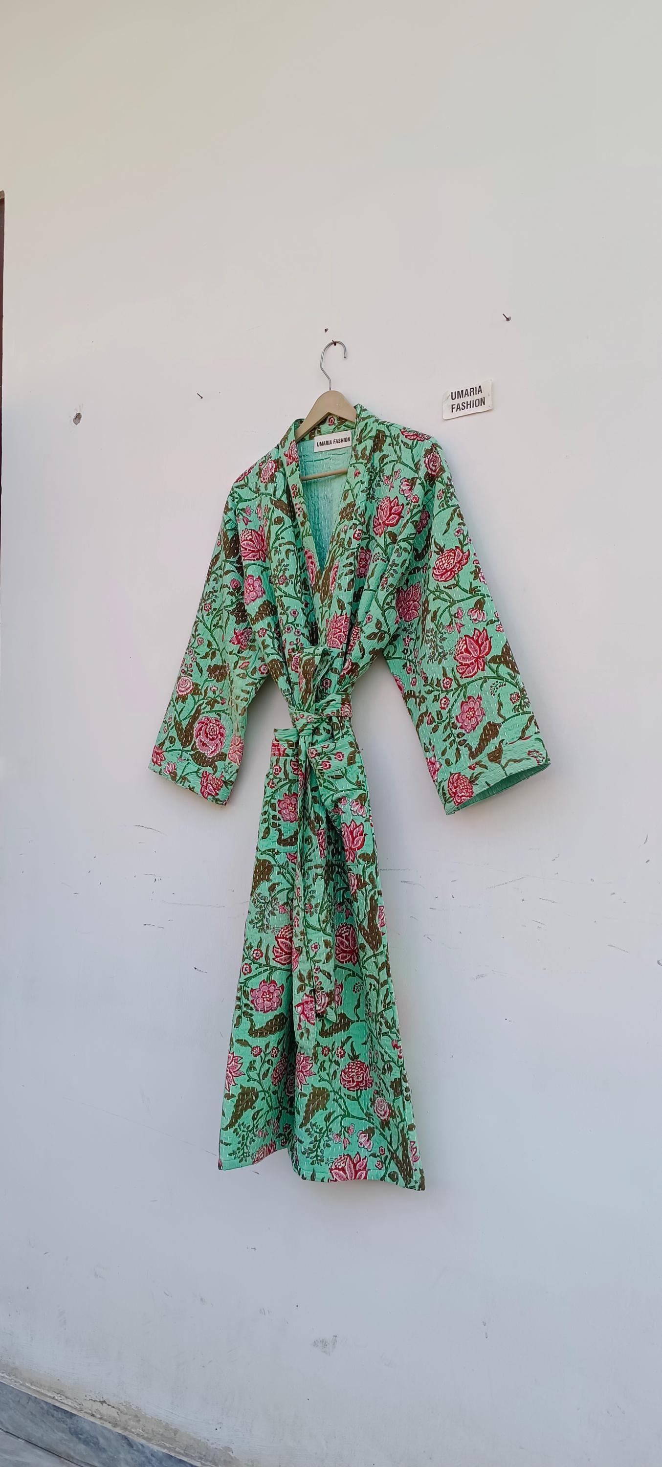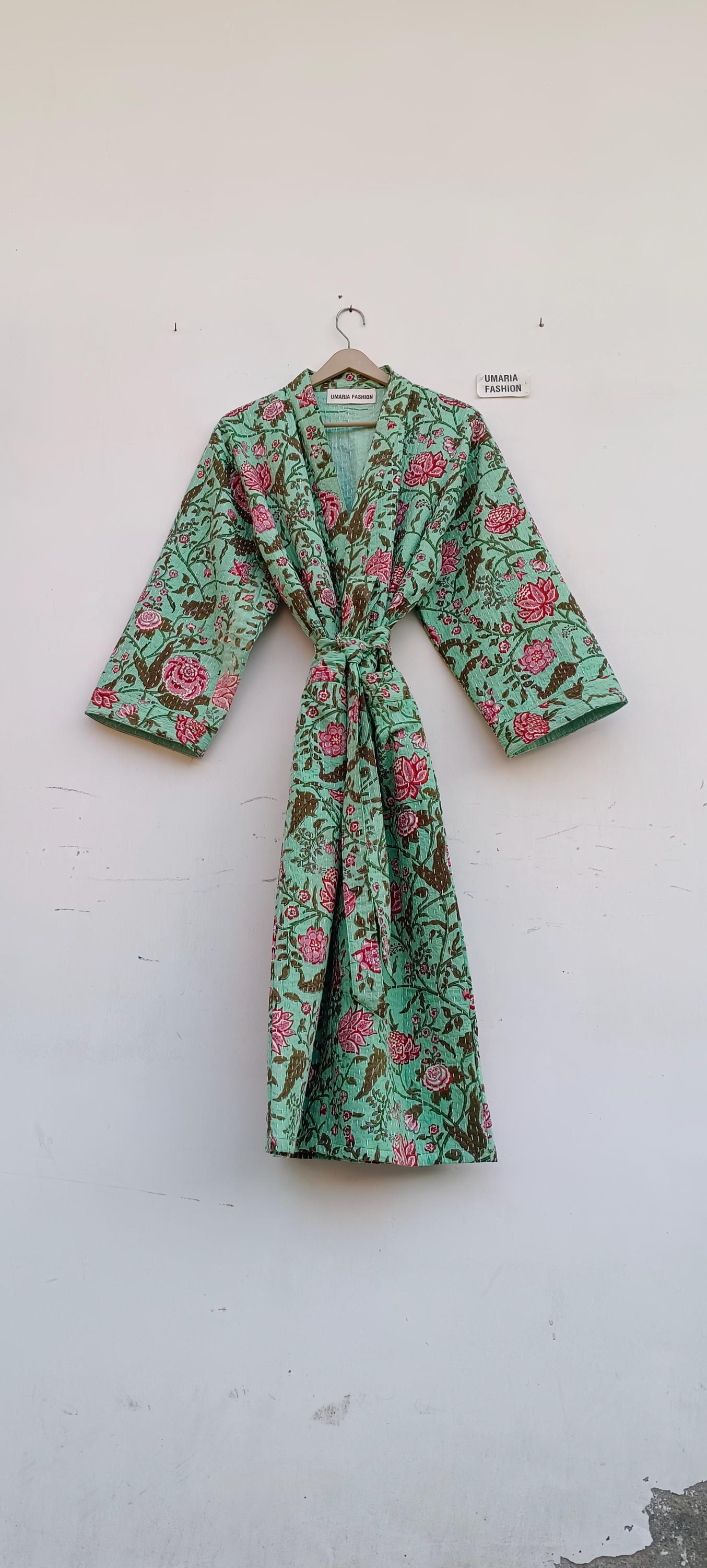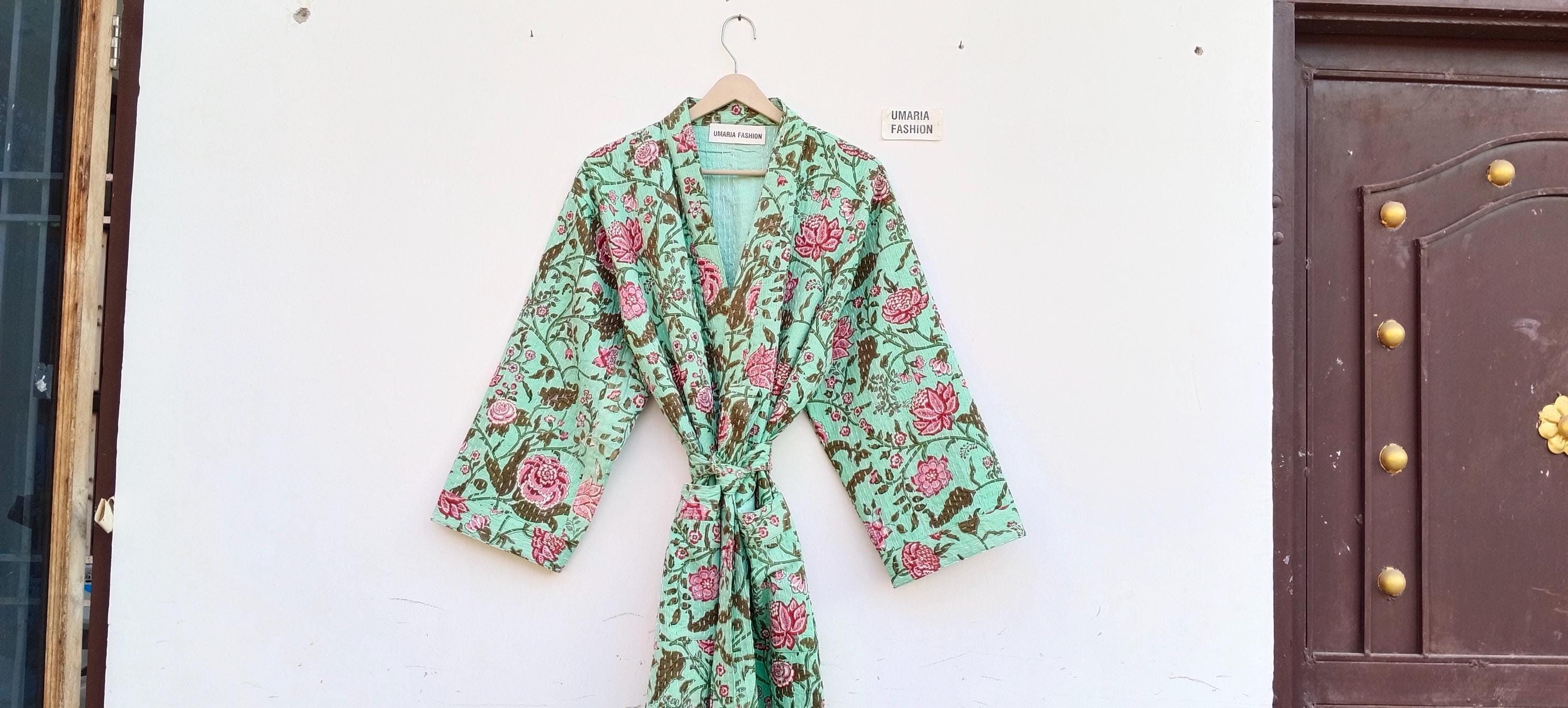 See details This Kimono is made of hand Kantha stitch fabric in patchwork . The fabric is a handmade printed fabric. Kantha stitch over the fabric gives it a unique look. It is two Layer of Cotton Kantha Stitch (Hand Quilted) Fabric Robe