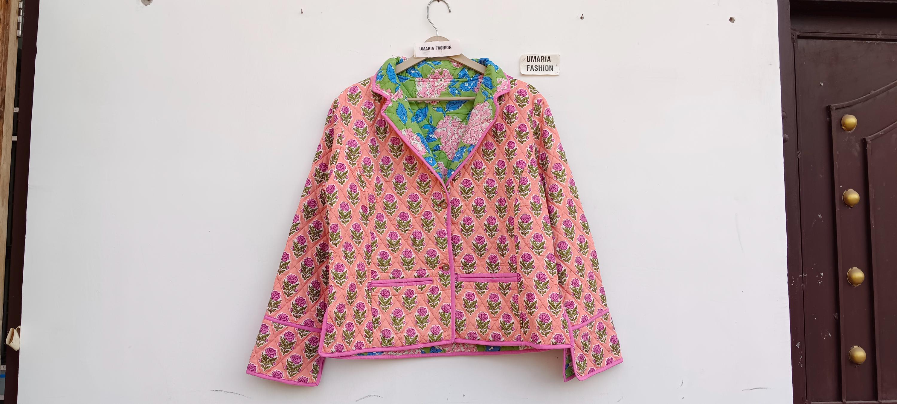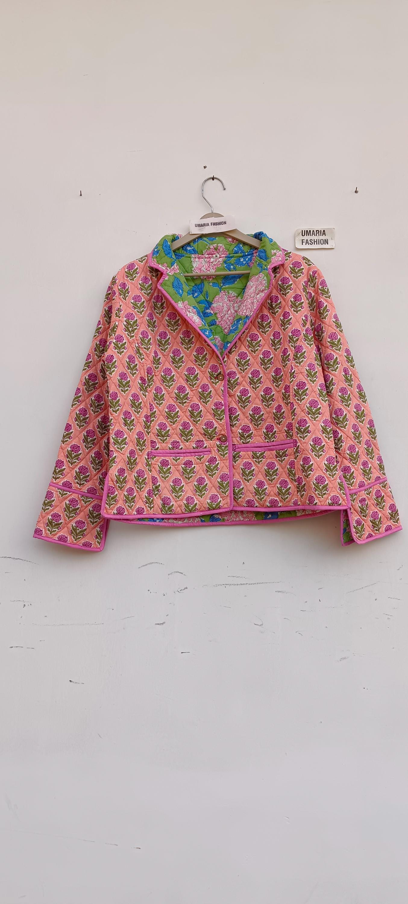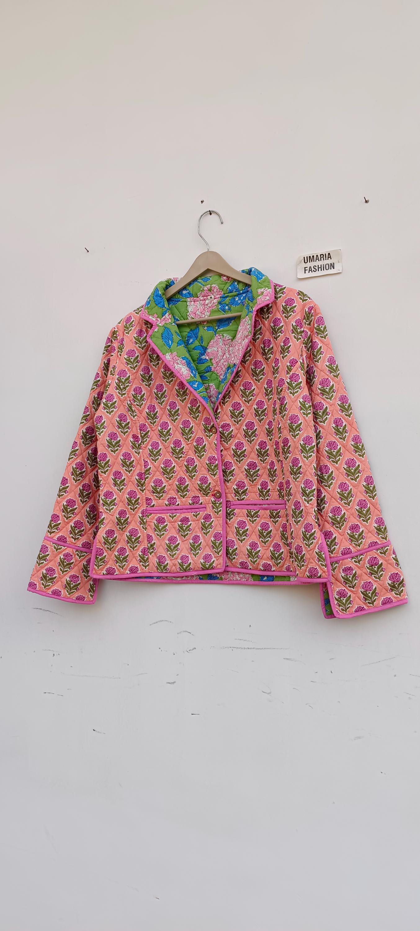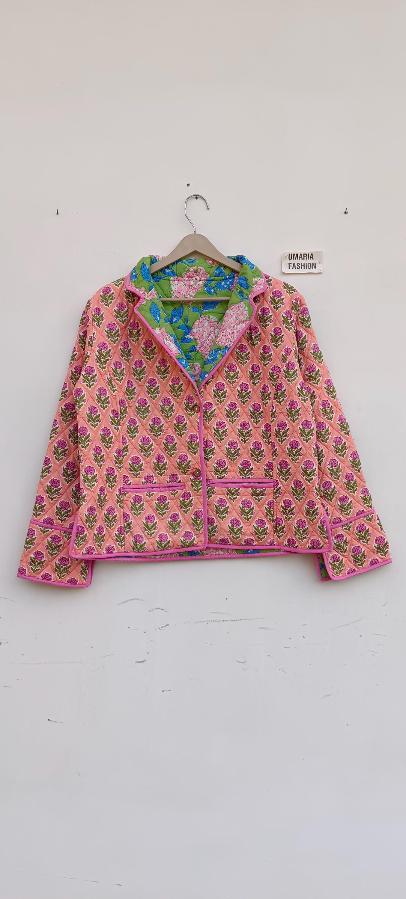 Cotton Quilted Jacket Women Wear Front Open Kimono Stripe piping HandMade Vintage Quilted Jacket , Coats , New Style, Boho Green Rainbow FREE SHIPPING/EXPRESS SHIPPING